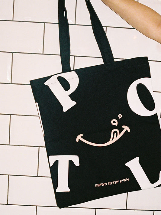 Prawn on the Lawn Black POTL Canvas Tote Bag
