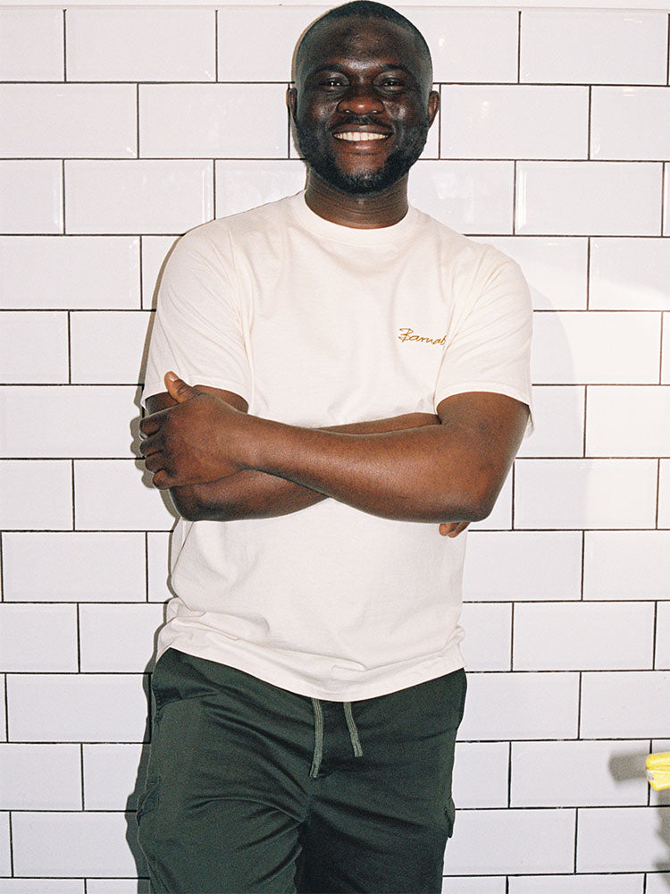 Unisex relaxed-fit, straight-cut soft cotton t-shirt in cream with a round, rib-trimmed neckline and dropped shoulders. Each t-shirt is hand screen printed in the UK by Done London. (Also available in olive green.)