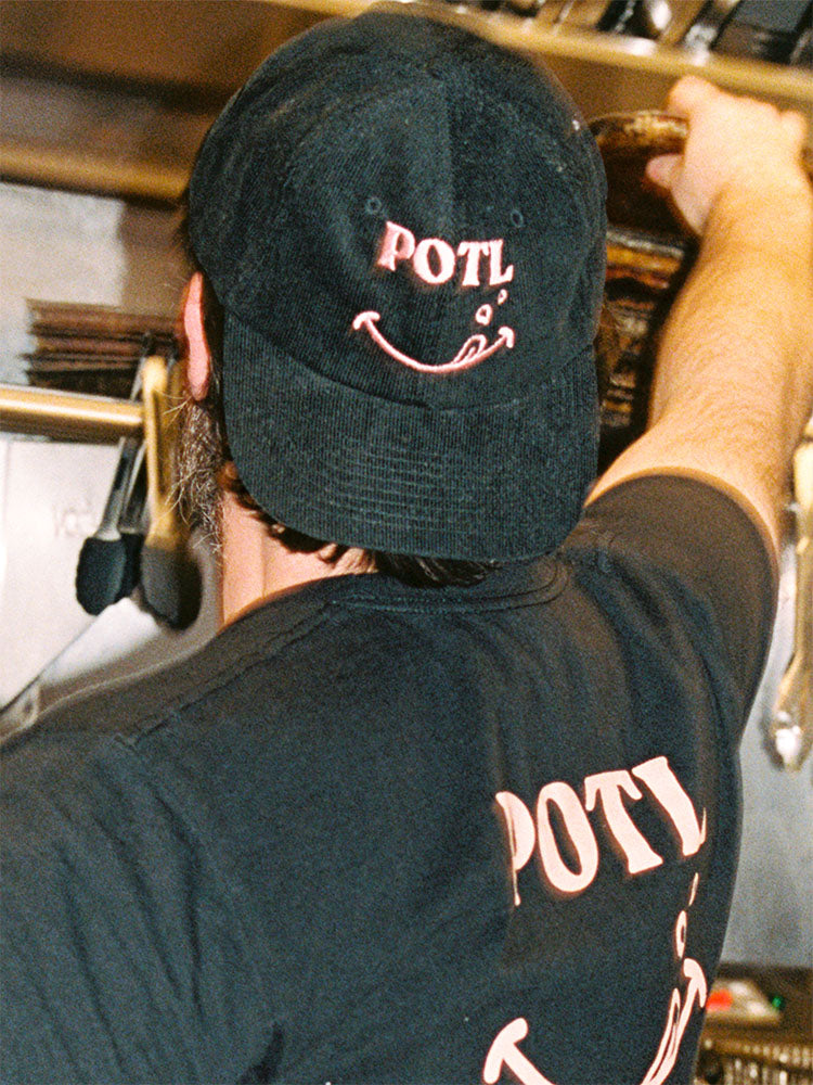 Peaked classic baseball cap in black corduroy featuring the POTL logo embroidered on the front in salmon pink.