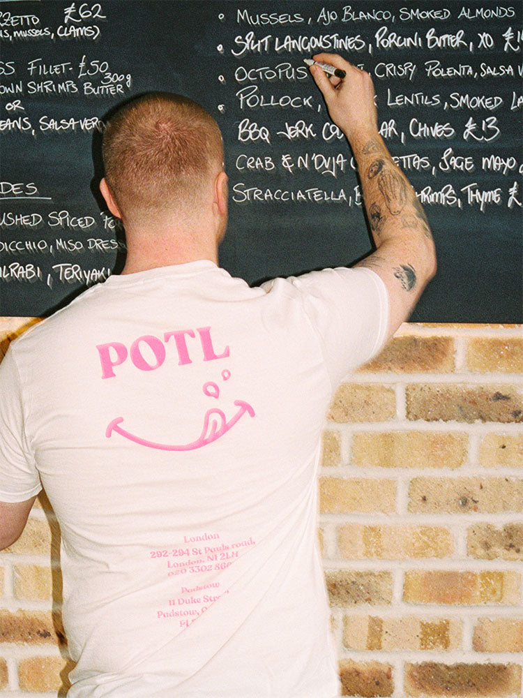 Features our classic POTL logo printed in neon pink on the front and back, with our London and Padstow restaurant locations on the back.